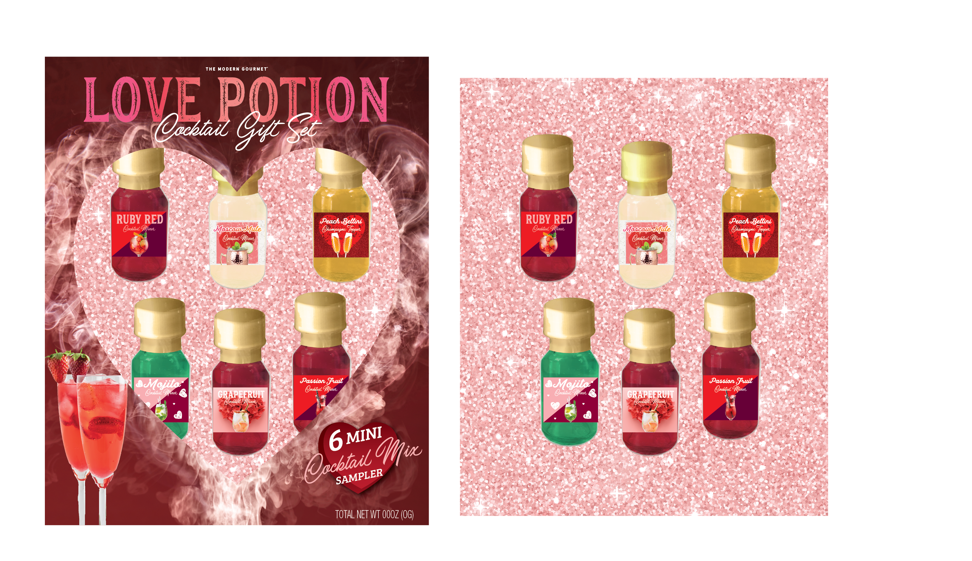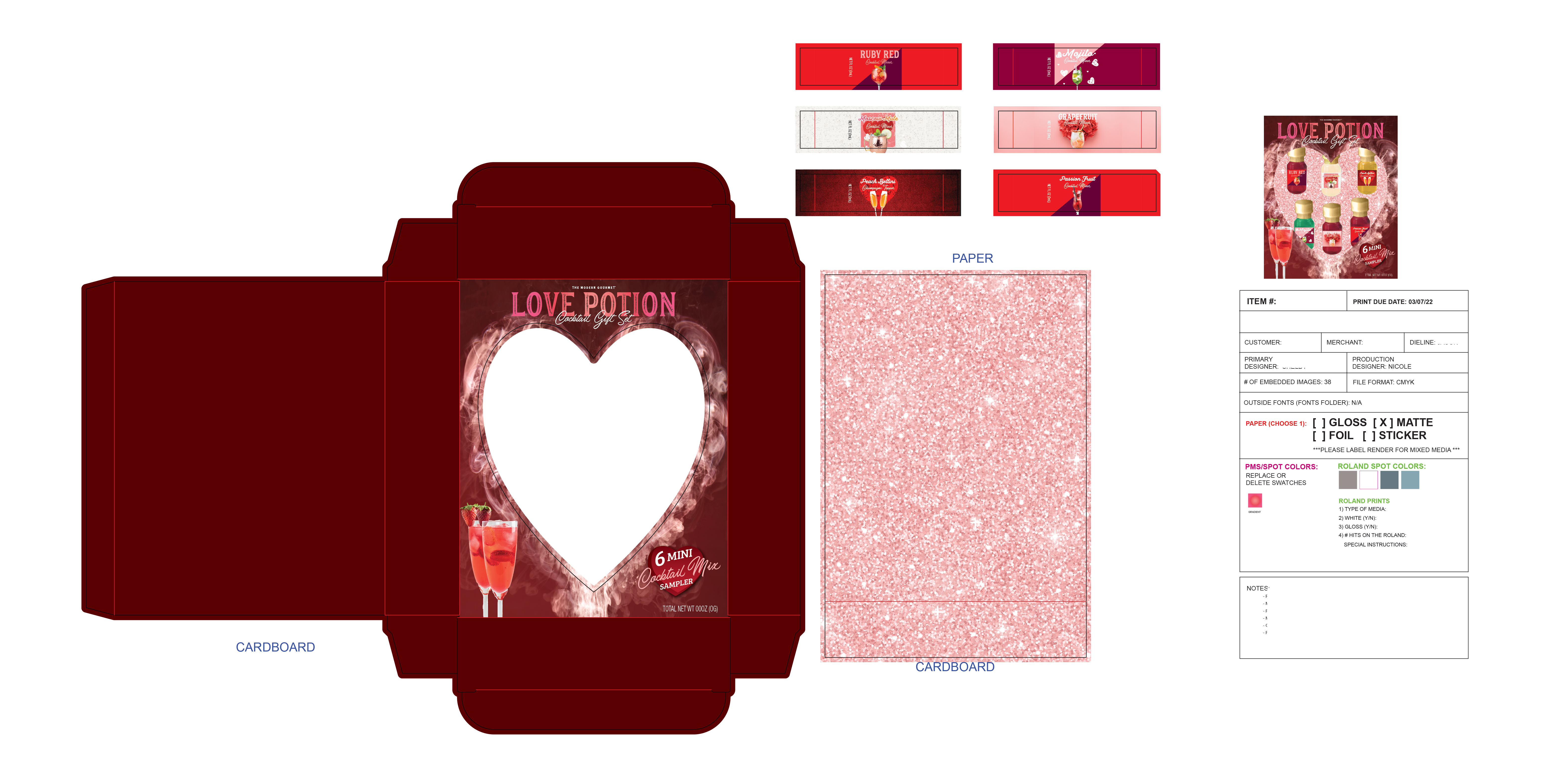 Modern Gourmet Foods specializes in food and beverage retail gifts. Designers hand off concepts for Sales and Production to create mockups. Sometimes limitations of physical products require some finesse of layouts to achieve the desired look and feel. A great example is the Love Potion here. The concept artist had a smaller footprint for the dieline, and visualized a more square layout. Ultimately the mockups give the desired impact, that carries over into mass production as seen in a local JoAnn’s Fabric.